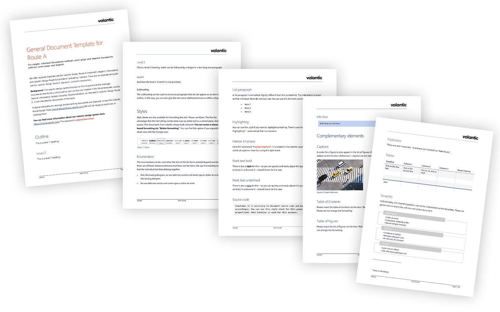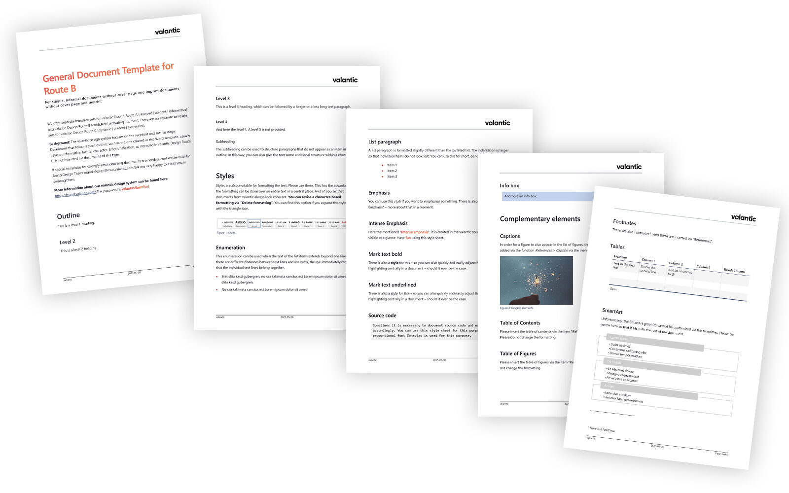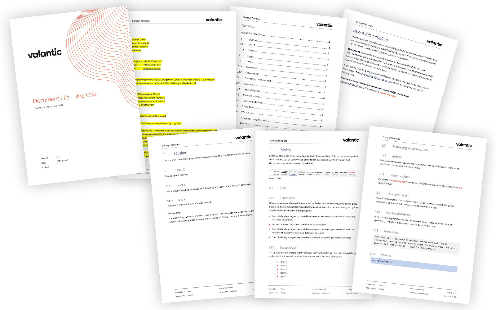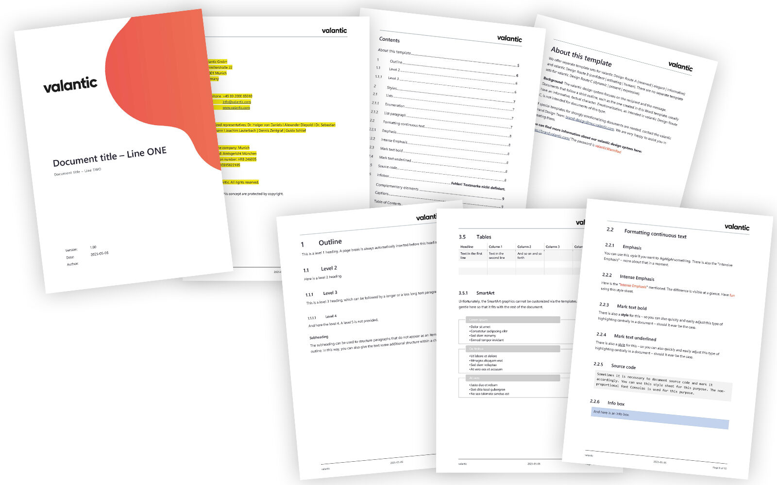 The valantic design system focuses on the recipient and the message. Documents that follow a strict outline, such as the one created in this Word template, usually have an informative, factual character. Emotionalization, as intended in valantic Design Route C, is not intended for documents of this type.