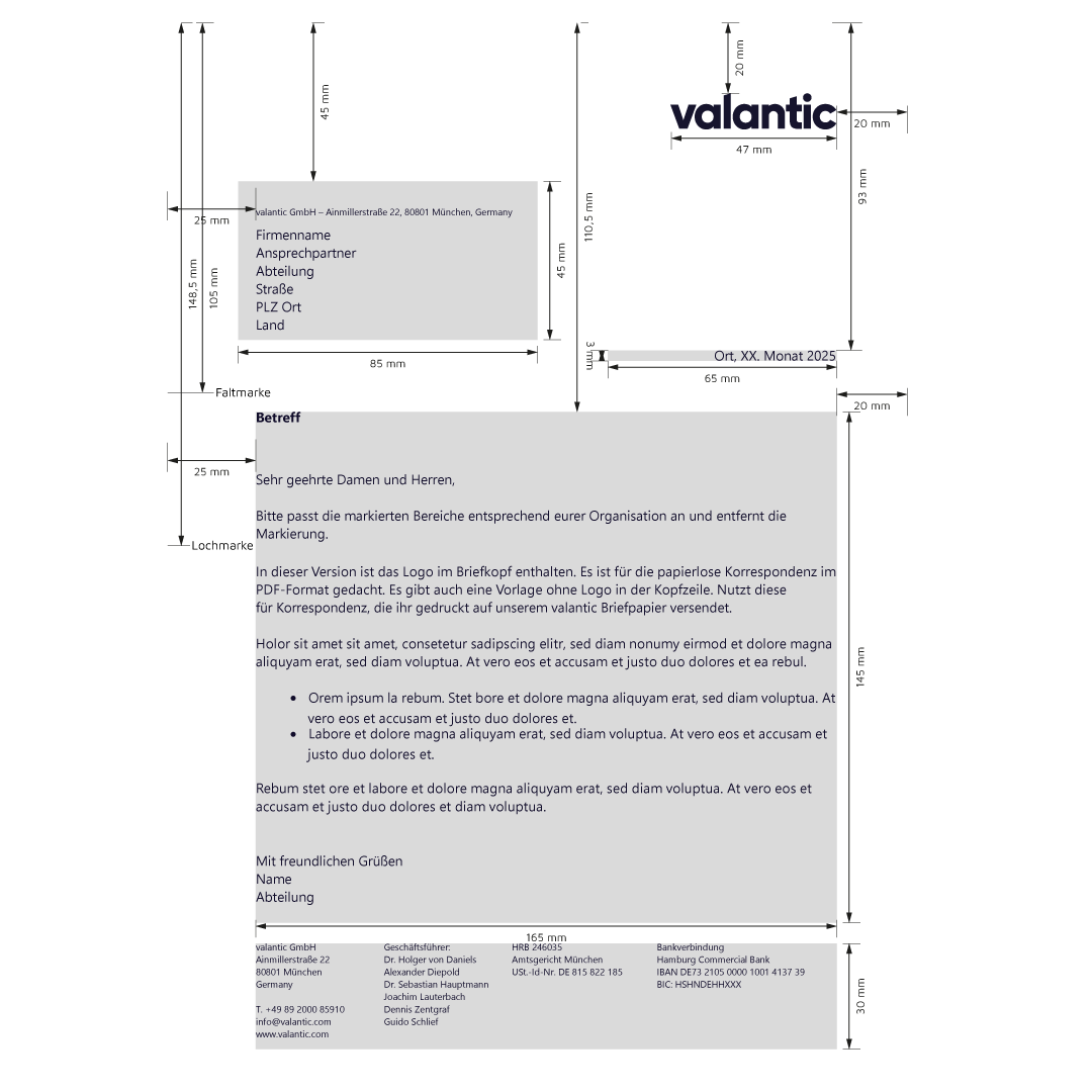 The valantic logo is integrated in our templates and is not printed, as it is on our corporate paper and color, which can be ordered in the Print Portal (Printshare) on the letterhead.